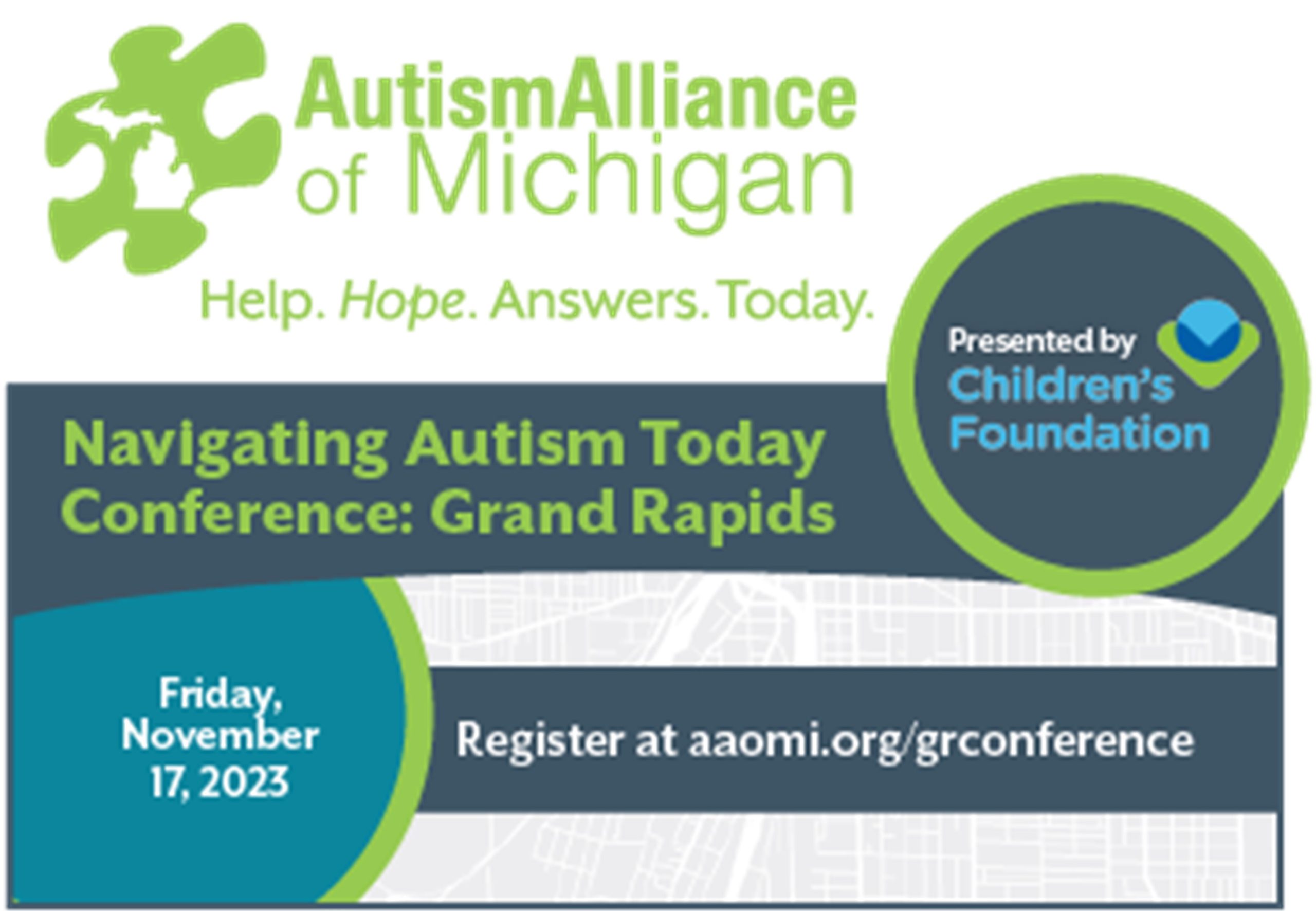 On Friday November 17, the Autism Alliance of Michigan (AAoM) will host a conference, “Navigating Autism Today” at the Grand Valley State University Pew Campus L.V. Eberhard Center from 8 a.m. to 3:30 p.m. AAoM welcomes parents, caregivers, families, and individuals living with autism as well as providers and educators to come, connect, and consider expanding their community networks and access to resources. The conference web page provides links to registration, sponsorship opportunities, and vendor table reservations.
