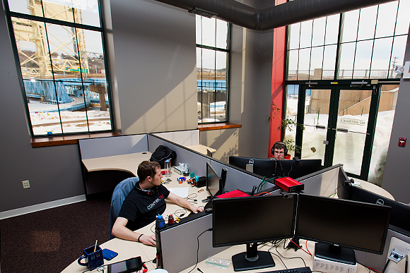 In a word, yes. SmartZone’s “Fortune 500 model” has enticed a handful of big-name conglomerates–including Ford and GE’s aviation division–to open satellite offices or outsourcing centers, mostly in partnership with Michigan Tech, around Houghton-Hancock. Jackson, Michigan-based insurer Jackson Life, for instance, rents space from SmartZone for its humming IT center. All told, the space employs about 30 Tech students as computer programming interns who work on various projects.