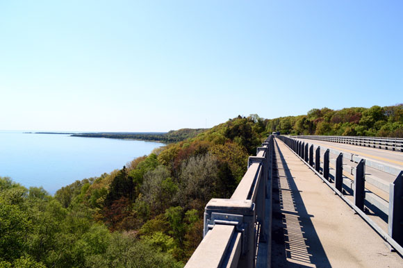 4. If you’d rather stick to the road, U.S. 2 (U.S. Bicycle Route 10) will give you 193 miles of U.P., St. Ignace to Iron Mountain. In the 90 miles of it I traveled, there were spectacular views of Lake Michigan, the amazing Cut River Bridge, and enough wilderness for a river otter to greet me. The shoulders are wide with rumble strips to keep a bike safe from traffic. Massive logging trucks will roar past, but their wood-scented breezes will give you a friendly, if somewhat intimidating, push.