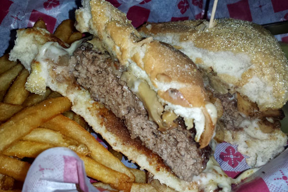 The outside looks like an old bar that you can tell has a lot of history behind it. When we walked inside it was small, but in a cozy way. There was a fire going in a wood stove in the back corner, practically everything was made out of wood and had a cozy cabin feeling. They even have a pool table (which I happen to love pool). The menu is small, with an appetizer section, a “basket” section which includes chicken and seafood (including fresh fish), and a large section of “from the grill.” The item that caught my eye was the Mushroom Swiss Burger.