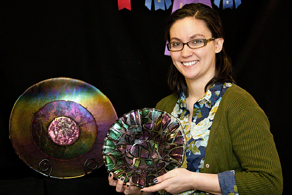 “The possibilities with fused glass were incredibly interesting to me, so I got started,” she says. “My father had already been doing stained glass from our home so we already had a glass studio set up in the garage. It was simple to add a few things, such as a kiln.”
