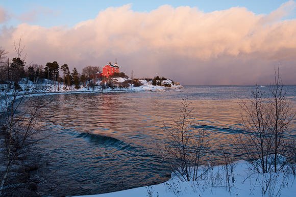 Don’t you just love the way the red of the light house stands out to the gray winter sky beyond and the chilling view of the water in the foreground?