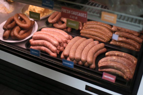 The market, related to the Das Steinhaus restaurant in downtown Marquette, aims to recreate an old-world food tradition similar to a village Metzgerei or butcher-shop feel, according to the owners. The Steinhaus Market includes a full-service restaurant, a beer garden and a delicatessen with a wide array of sausages, meats, specialty cheese, wines and beers, and other prepared dishes as well as specialty ingredients and accompaniments.
