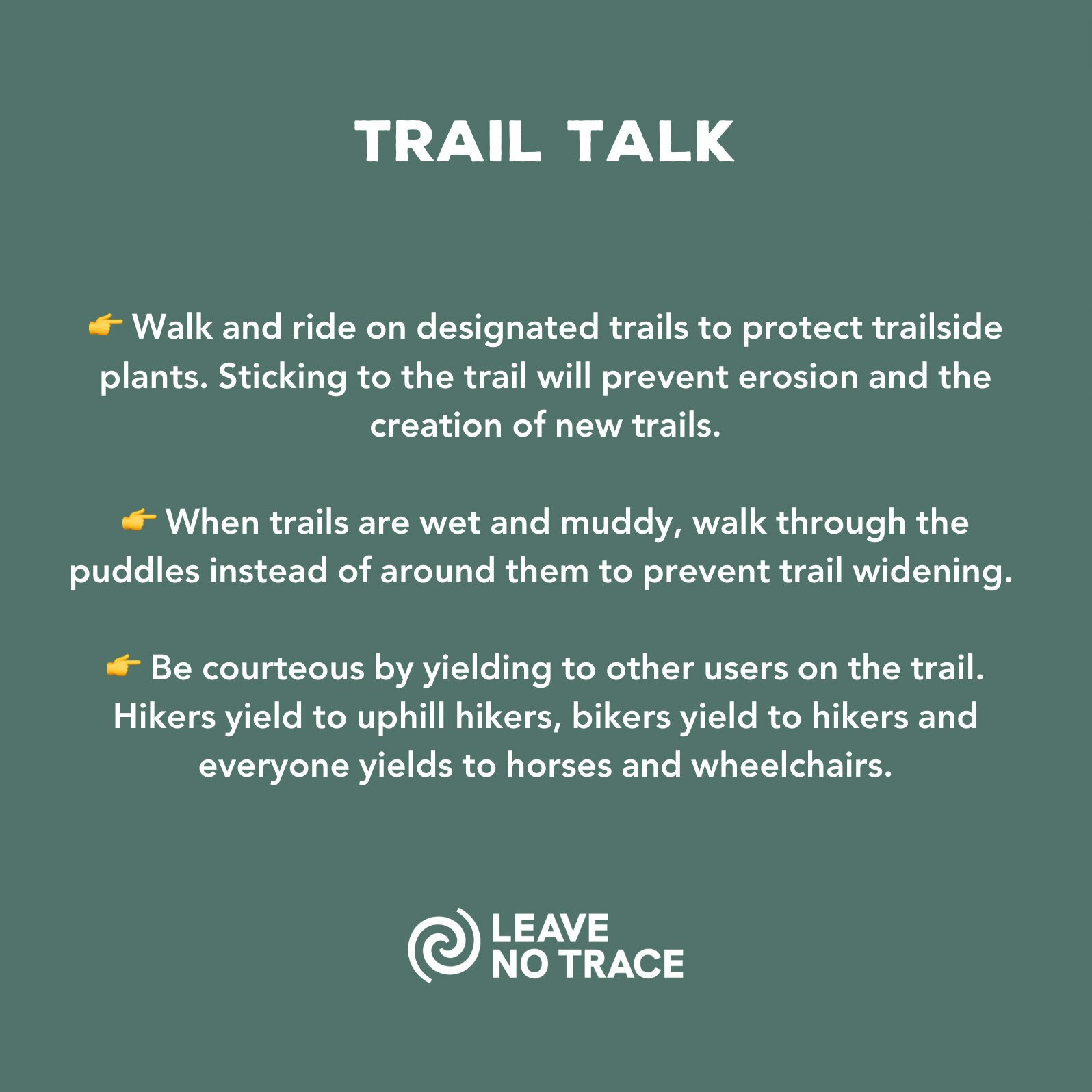 Another reminds hikers to “Stick to trails and campsites.” “Walk and ride on designated trails to protect trailside plants and respect private property” Others pertain to trash and managing human waste, campfire etiquette, wildlife, and sharing trails and managing pets.