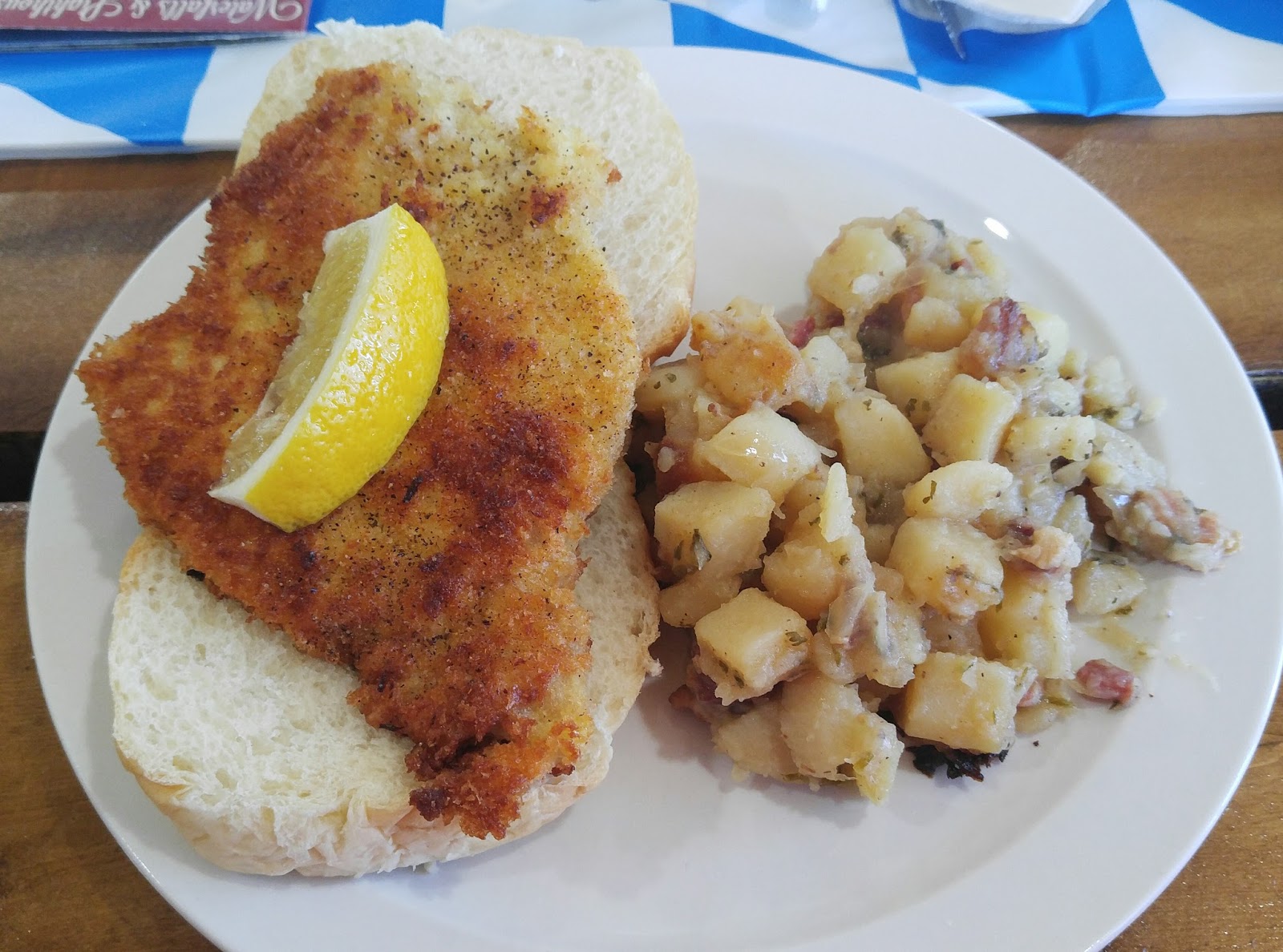 For lunch we both ordered the pork schnitzel. I’ve noticed that in German restaurants around the area I always end up ordering pork schnitzel, so by now I should be an expert at it. The pork on the inside of the breading was juicy and tender. I had to slather the bun with mustard because between the breaded pork and bun, it was a slightly dry sandwich. The potato salad was delicious and flavorful between the herbs and what looked like small bits of ham or some form of deli meat. The only thing I would change about this is that it came with more toppings, or if they served the schnitzel on top of some cooked cabbage just to add some moisture. Otherwise, it was good.