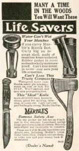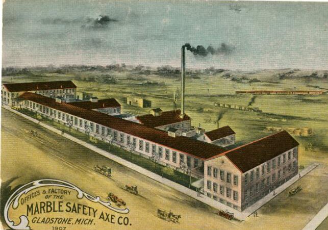 While inventing outdoors tools in his shed, Marble initially went back to the woods as a land cruiser to support his family. But his tool-making side business grew and grew, so he quit land cruising to nurture it. By 1907, his backyard shed operation had grown into an enormous manufacturing plant that covered several blocks and employed hundreds. There he manufactured invention after invention, such as the Marble Ideal Knife for hunting and camping and a waterproof match box that he invented after he fell into the Sturgeon River and soaked his matches.